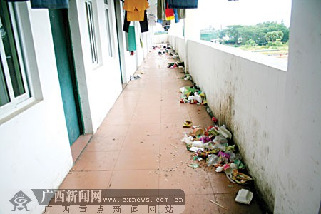 記者順著樓梯上樓,樓梯顯然幾天沒有打掃,到處丟滿了垃圾。在每個樓層的走廊上,也丟滿了垃圾,部分走廊幾乎被垃圾占去了一半。記者隨后走訪多棟學生宿舍樓,所見情況也與4棟無異。該校一學生介紹,以前宿舍樓梯、走廊都有人負責清掃,他們只需將垃圾打包,放在宿舍門口就會有清潔工清理。自從學校要求學生自行清掃宿舍后,學生都是將垃圾掃到走廊上了事,沒過幾天,學生宿舍樓的過道、走廊、樓梯都堆滿了垃圾。