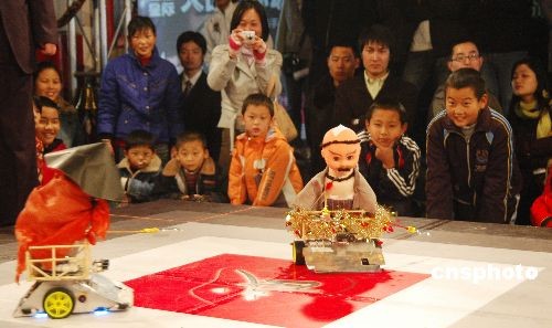 12月20日,“2008中國(guó)機(jī)器人大賽活動(dòng)在蘇州木瀆科技創(chuàng)業(yè)園舉行,來自全國(guó)各款頂級(jí)版智能機(jī)器人紛紛走臺(tái)亮相。這些機(jī)器人可以完成走路、翻滾、伏地挺身及單腿平衡等接近于人體活動(dòng)的各種動(dòng)作,吸引了數(shù)百名機(jī)器人愛好者前來觀戰(zhàn)。中新社發(fā) 朱子寒 攝