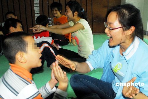 2009年4月2日是第2個世界自閉癥日,海南省?谑懈骷姨亟膛嘤枡C構(gòu)紛紛開展家長聯(lián)誼、趣味游戲等活動,讓親情和訓練相結(jié)合敲開自閉癥孩子的“心門”。自閉癥也稱孤獨癥,是以嚴重孤獨、缺乏情感反應、語言發(fā)育障礙、刻板重復動作和對環(huán)境的奇怪反應為特征的精神疾病。據(jù)統(tǒng)計,目前中國約有各類自閉癥患者150萬人,其中兒童約有50萬人左右。中新社發(fā) 善平 攝