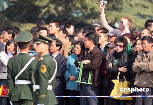 十月二十一日,中國共產(chǎn)黨第十七次全國代表大會在北京人民大會堂閉幕,天安門廣場外聚集許多關注大會盛況的民眾。中新社發(fā) 毛建軍 攝