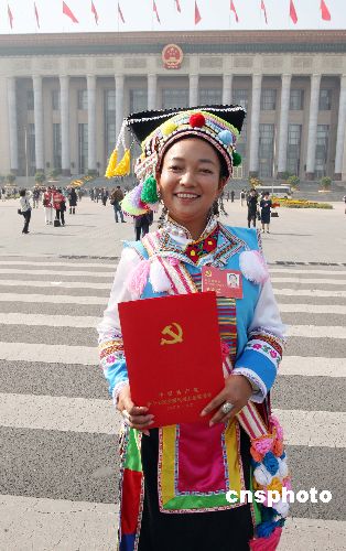 十月二十一日,中國(guó)共產(chǎn)黨第十七次全國(guó)代表大會(huì)在北京人民大會(huì)堂閉幕,布朗族女代表李鳳梅喜氣洋洋走出會(huì)場(chǎng)。中新社發(fā) 毛建軍 攝