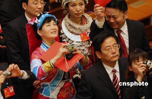 中國共產(chǎn)黨第十七次全國代表大會10月21日上午在北京人民大會堂閉幕,退場的貴州代表團代表與在大會堂二樓的記者相互拍照。中新社發(fā) 任晨鳴 攝
