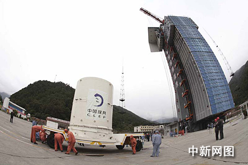 “嫦娥一號”衛(wèi)星運(yùn)抵西昌衛(wèi)星發(fā)射中心三號發(fā)射塔。作者:胡建兵