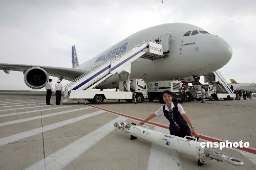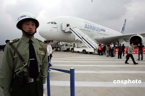 十月二十五日,空中客車A380飛機(jī)在上海浦東國(guó)際機(jī)場(chǎng)展示,據(jù)悉,這架生產(chǎn)序列號(hào)為007的A380是首度在上海公開(kāi)其豪華客艙內(nèi)飾?湛凸ぷ魅藛T在此間表示,A380目前獲得十六家客戶的一百八十九架確認(rèn)及承諾訂單,○八年將交付十三架,○九年交付二十五架,到二○一○年,將年產(chǎn)四十架,而中國(guó)南方航空訂購(gòu)的五架A380計(jì)劃在○九年下半年交付。中新社發(fā) 潘索菲 攝