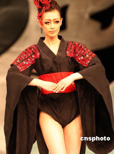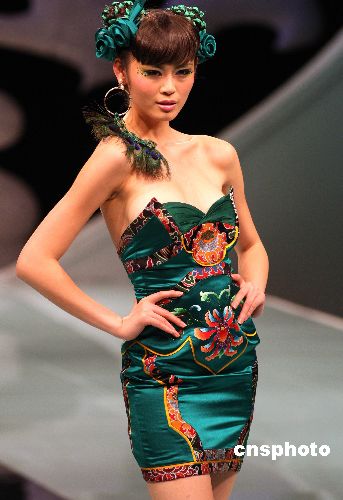 11月3日晚,在北京中國國際時裝周上著名時裝品牌NE·TIGER推出“錦繡國色華夏禮服”NE·TIGER2008高級華服發(fā)布會,設(shè)計(jì)師張志峰在禮服色彩搭配以及款式風(fēng)格上大膽創(chuàng)新,以中華傳統(tǒng)民族文化為底蘊(yùn),融合現(xiàn)代時裝多元素風(fēng)格突出作品自然質(zhì)樸又呈現(xiàn)出高貴而莊重的氣質(zhì)。圖為模特展示該品牌推出的最新設(shè)計(jì)作品。中新社發(fā) 錢興強(qiáng) 攝
