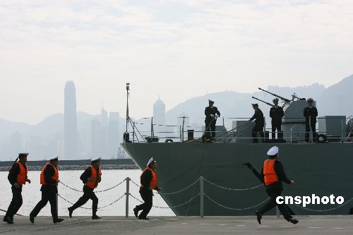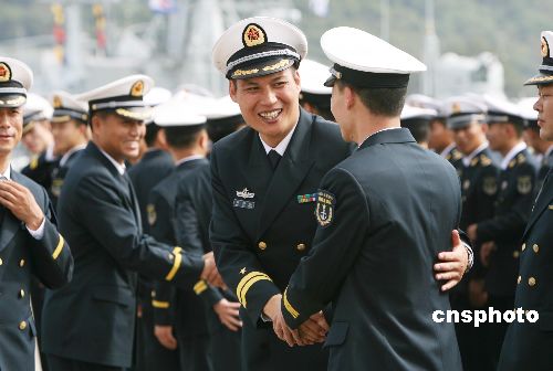 圖為輪換出港和進(jìn)港的海軍官兵親切問(wèn)候。