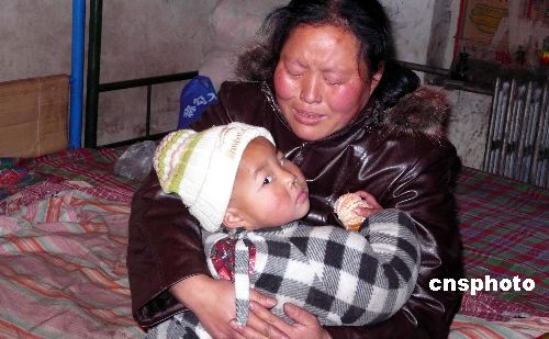 一名抱著孩子的山西洪洞煤礦爆炸遇難礦工家屬聽到噩耗后悲痛欲絕。