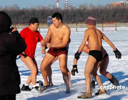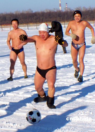 圖:中俄50余名冬泳健兒黑龍江上賽足球(2)