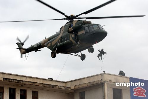 圖為訓(xùn)練中,中印參演軍人乘武裝直升機垂直進入演練地域。