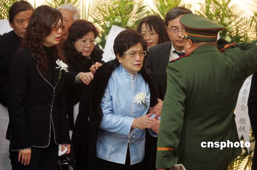 圖為孫道臨妻子王文娟(中)與女兒(左)在追悼會上。