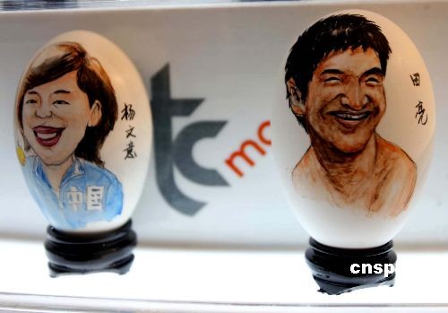 近日,香港世貿(mào)中心以奧運(yùn)為主題,配合傳統(tǒng)民間藝術(shù)舉辦“復(fù)活蛋藝展”,給香港觀眾帶來充滿特色的蛋藝展覽。三部分二百件的彩繪蛋畫、蛋雕和卵石畫作品栩栩如生。圖為奧運(yùn)金牌風(fēng)云人物田亮、楊文意蛋雕。中新社發(fā) 洪少葵 攝