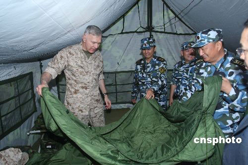 圖為美國海軍陸戰(zhàn)隊司令參觀中國海軍陸戰(zhàn)隊野戰(zhàn)睡具。中新社發(fā) 李唐 攝