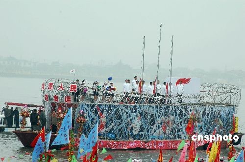 4月6日,第三屆中國濕地生態(tài)旅游節(jié)暨2008中國姜堰·溱潼會船節(jié)在江蘇省姜堰市溱湖風景區(qū)開幕。當?shù)厝罕娤驍?shù)十萬中外來賓再現(xiàn)了“天下第一會船”的盛況。會船節(jié)上展示的“鳥巢”貢船迎奧運吸引了眾多觀眾的眼球。中新社發(fā) 楊素平 攝