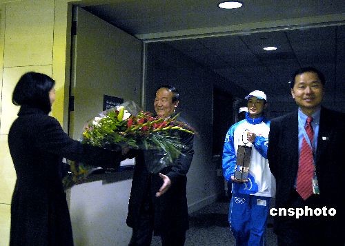圖為北京奧組委執(zhí)行副主席蔣效愚和圣火護(hù)衛(wèi)員步出機(jī)艙,當(dāng)?shù)厝A人獻(xiàn)花迎接。作者: 陳鋼
