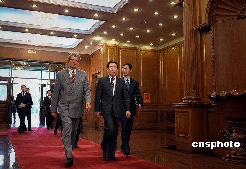 四月九日,朝核問題六方會談中方團長武大偉在北京釣魚臺國賓館會晤俄方代表俄駐華大使拉佐夫。中新社發(fā) 廖攀 攝