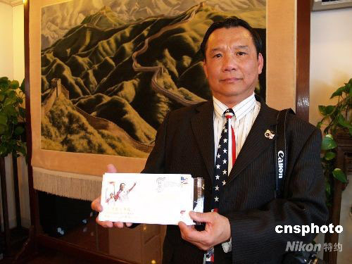 4月13日,美國郵政局發(fā)行“2008年北京奧運(yùn)圣火傳遞舊金山首日封”。這枚首日封由華人設(shè)計(jì)師魏進(jìn)發(fā)設(shè)計(jì)。中新社發(fā) 盧威 攝