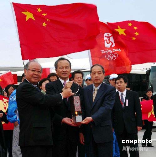 中國(guó)駐日大使崔天凱(中)到機(jī)場(chǎng)迎接奧運(yùn)圣火抵達(dá)日本。