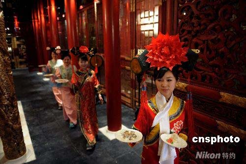 穿著“格格”服裝的服務(wù)員為北京老舍茶館新增設(shè)的小滿漢全席上菜,該席最高消費(fèi)3000元每人。中新社發(fā) 廖攀 攝