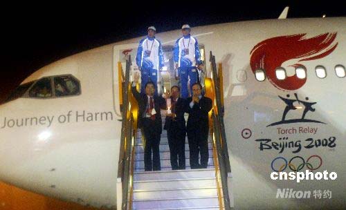4月28日晚10時57分,載著北京奧運圣火的“奧運圣火號”抵達“和諧之旅”海外傳遞第十九站——越南的胡志明市。北京奧運圣火在胡志明市的傳遞將于29日晚6時開始,從位于該市中心的大劇院出發(fā),經(jīng)過多處著名地標后,抵達設(shè)在終點第七軍區(qū)體育館,全程長約十多公里。圖為北京奧組委執(zhí)行副主席李炳華(中)手持圣火燈走下飛機。 中新社發(fā) 沈晨 攝