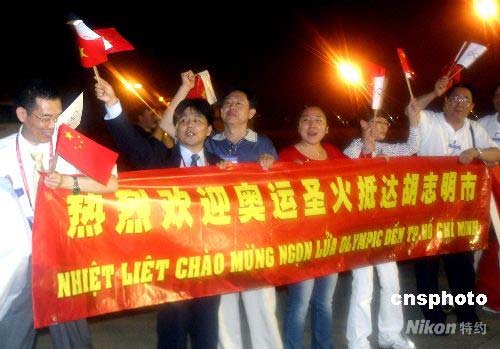 華人華僑在胡志明市國際機(jī)場歡迎奧運(yùn)圣火到來。中新社發(fā) 沈晨 攝