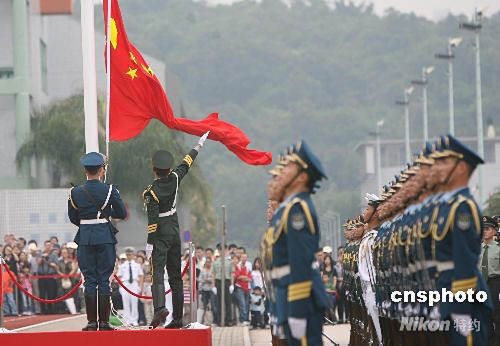 圖為市民在昂船洲軍營(yíng)觀看升旗。