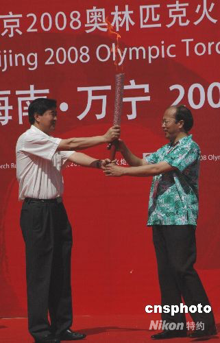 圖為北京奧組委火炬接力官員(左)將火炬交給萬寧市委書記李秀領(lǐng)(右)。