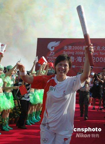 5月6日,北京奧運(yùn)圣火在中國境內(nèi)海口市傳遞,為海南省贏得第一枚金牌的帆板運(yùn)動(dòng)員王麗芳傳遞?诘谝话簟D為她從起點(diǎn)儀式上起跑。中新社發(fā) 王辛莉 攝