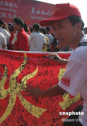 一名?谇嗄曛驹刚咴谥С謯W運(yùn)的條幅上簽字。 中新社發(fā) 王辛莉 攝