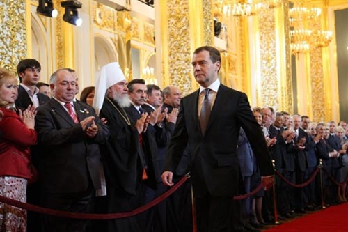 當(dāng)?shù)貢r間5月7日12時(北京時間下午4時),在俄羅斯總統(tǒng)選舉中勝出的當(dāng)選總統(tǒng)德米特里•梅德韋杰夫, 在克里姆林宮正式宣誓就職,成為俄羅斯第三位總統(tǒng)。