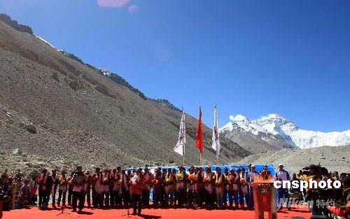 北京奧運(yùn)火炬接力珠峰傳遞中國(guó)登山隊(duì)凱旋慶祝儀式在珠峰大本營(yíng)舉行。中新社發(fā) 盛佳鵬 攝