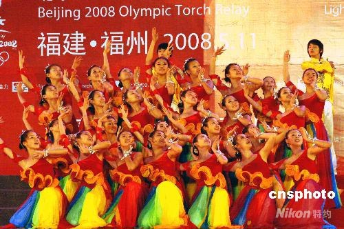 5月11日晚,為慶祝奧運(yùn)圣火福州傳遞圓滿成功,北京奧運(yùn)會(huì)火炬接力境內(nèi)傳遞福建福州站慶典儀式文藝晚會(huì)在福州望龍臺(tái)公園舉行。中新社發(fā) 劉可耕 攝