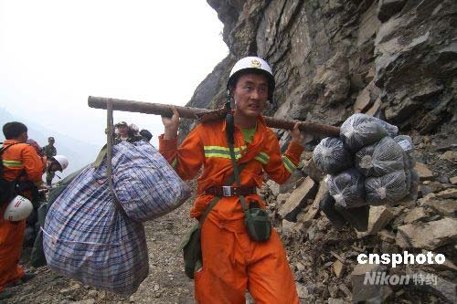 經(jīng)過水路運(yùn)輸,武警步行十多公里將救災(zāi)物資肩挑背扛運(yùn)送到汶川縣映秀鎮(zhèn)。中新社發(fā) 郭國權(quán) 攝