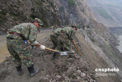 武警在搶修到汶川縣映秀鎮(zhèn)的公路。中新社發(fā) 郭國權 攝