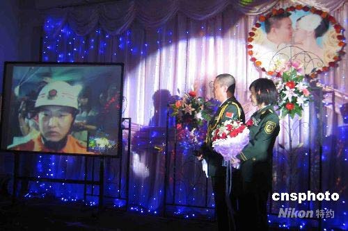 遼寧省遼陽市白塔消防大隊(duì)鐵西中隊(duì)副中隊(duì)長郎猛赴四川抗震救災(zāi),他與陜西省寶雞市扶風(fēng)消防大隊(duì)副指導(dǎo)員常芳的婚禮如期舉行。5月17日,新娘常芳在郎猛的家鄉(xiāng)遼寧省新民市舉行了一場特殊的婚禮。中新社發(fā) 沈殿成 攝