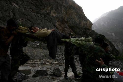 成都軍區(qū)駐渝某集團(tuán)軍紅軍師步兵團(tuán)翻山越嶺解救汶川大地震茂縣羌寨兩位女傷員,傍晚成功送到前來(lái)支援的解放軍第二軍醫(yī)大學(xué)醫(yī)療隊(duì)。中新社發(fā) 賈國(guó)榮 攝