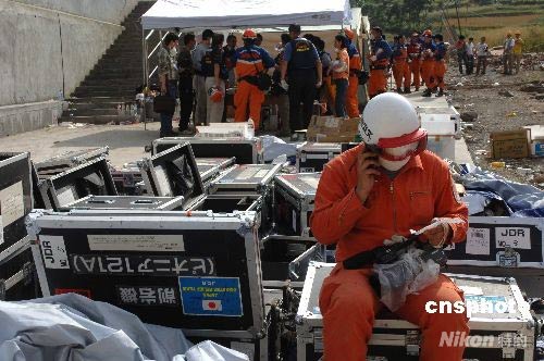 5月18日,日本國際救援隊一行二十余人到達中國四川北川地震現(xiàn)場——北川中學(xué),利用國際先進的探測儀器與中國兩支救援隊分別挖掘廢墟,救援受難學(xué)生。經(jīng)過共同探測,在沉入地下的樓層內(nèi)發(fā)現(xiàn)有三個生物體存在,但挖掘極為危險和困難,生者生命渺茫。圖為日本救援隊成員在休息時依然思考救援問題。中新社發(fā) 鄒憲 攝