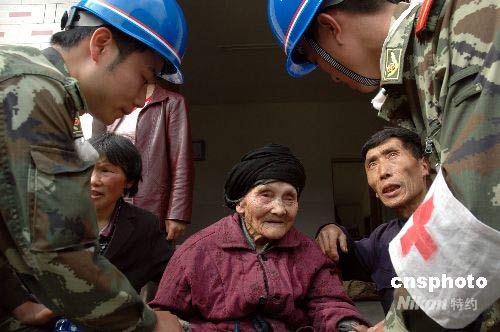 5月21日,在四川平武縣平通鎮(zhèn)大松村抗震救災(zāi)的廣安武警成功將一位百歲老人解救下山。當(dāng)日,在四川汶川大地震重災(zāi)區(qū)四川平武縣平通鎮(zhèn)抗震救災(zāi)的武警廣安市支隊李林麒等20名官兵,徒步翻山越嶺來到海拔1600多米高的大松村,奮戰(zhàn)3個多小時,成功將一位30年沒有下過山、雙目失明的百歲老人李孝珍解救下山。中新社發(fā) 邱海鷹 攝