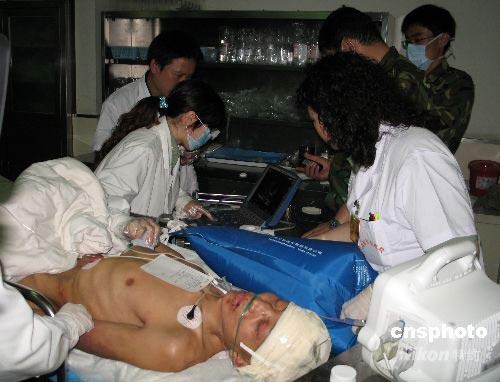 5月21日,四川省綿竹縣被埋8天8夜零4小時(196個小時)的天池煤礦礦工賴元平被救出,經解放軍255醫(yī)院醫(yī)療隊急救后由成都軍區(qū)直升飛機接至成都軍區(qū)總醫(yī)院救治。傷者在該院作CT檢查時被發(fā)現(xiàn)腦有內巨大血腫,時刻有生命危險,成都軍區(qū)總醫(yī)院顧建文副院長和解放軍301總醫(yī)院周定標教授研究后決定立即手術。手術由顧建文副院長主刀,1小時40分鐘后手術完成,術后傷員生命體癥平穩(wěn)。中新社發(fā) 朱琥姚遠 攝