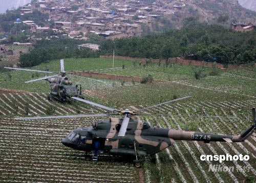 成都軍區(qū)陸航團(tuán)空降救兵到受災(zāi)嚴(yán)重的高山羌寨,建立救災(zāi)基地。中新社發(fā) 賈國榮 攝