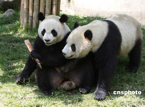 5月23日,準備贈送給臺灣的大熊貓團團和圓圓,在四川汶川大地震后的臥龍大熊貓保護區(qū)內(nèi)無憂無慮地戲耍。中新社發(fā) 任晨鳴 攝
