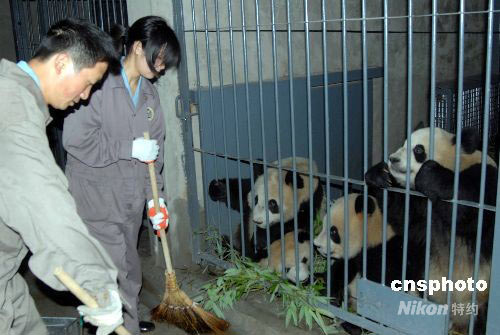 5月24日,來(lái)自四川臥龍的8只大熊貓平安抵達(dá)北京動(dòng)物園,開(kāi)始新的生活。圖為管理員在清掃圈舍。中新社發(fā) 羅小韻 攝