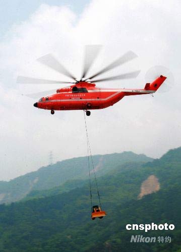 5月26日,一架號稱“空中巨無霸”的米-26重型運(yùn)輸直升機(jī)在四川綿陽任家坪吊運(yùn)鏟車、挖機(jī)等工程機(jī)械到唐家山堰塞湖。另悉,位于北川縣城上游的唐家山堰塞湖是目前汶川大地震形成的最大的堰塞湖,也是目前四川震區(qū)已發(fā)現(xiàn)的三十四處堰塞湖中體量最大、最險(xiǎn)的一處。中新社發(fā) 陳地長 攝
