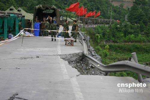 “5.12”四川汶川大地震中,彭州小魚洞大橋被震斷,已不能通行。圖為5月28日,濟(jì)南軍區(qū)官兵在大橋兩側(cè)警戒。中新社發(fā) 楊杰 攝