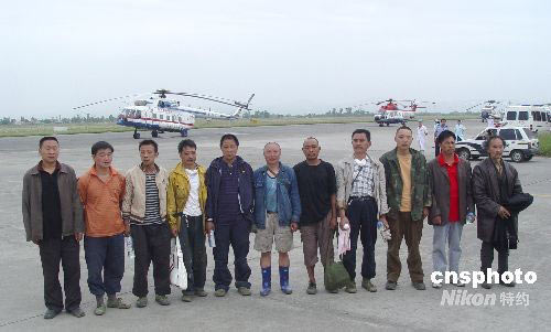 5月29日下午,被困17天的10名清平磷礦礦工,被民航直升機(jī)救出。剛走下飛機(jī)的被救礦工付學(xué)斌說,這17天來靠吃野菜和直升機(jī)空投的食品維持生命。5月12日那天,地震時(shí)他們都在磷礦上班,傷亡不是很大,主要是在家的親人都被這次地震給吞沒了。執(zhí)行這次營(yíng)救任務(wù)的是中信海直的AS332型7961號(hào)和東方通用航空的米171型7856號(hào)飛機(jī)。據(jù)民航直升機(jī)抗震指揮部副總指揮關(guān)立欣講,受天氣影響,全天共出動(dòng)直升機(jī)10架次,執(zhí)行飛行任務(wù)24架次,運(yùn)進(jìn)救災(zāi)物資10.1噸,救援人員13人,接運(yùn)出被困群眾和傷員47人,財(cái)務(wù)檔案600公斤。中新社發(fā) 張鈺昱 攝
