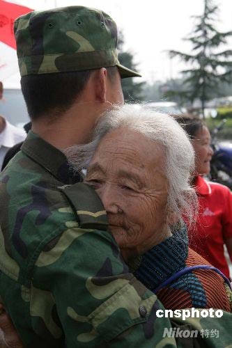 5月31日上午9時,在四川都江堰市海蓉藥業(yè)公司門口,濟南軍區(qū)某工兵團的43名都江堰籍抗災官兵在部隊轉(zhuǎn)場之際與他們的親人做30分鐘的短暫團聚。