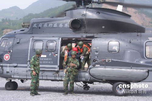 圖為香港特區(qū)政府飛行服務(wù)隊(duì)一架直升機(jī)載著獲救礦工降落在四川廣漢機(jī)場(chǎng)。中新社發(fā) 潘其武 攝