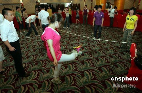 五百余名北京單身青年6月1日在某婚戀網(wǎng)站的組織下,參加一場主題為“找個老婆過家家”的相親派對,“歡度六一國際兒童節(jié)”。青年男女們在現(xiàn)場一起“丟手絹”、“抓人”、“跳房子”、“老鷹抓小雞”,一個個經(jīng)典的童年游戲,讓現(xiàn)場的會員很快消除了陌生感。中新社發(fā) 楊可佳 攝