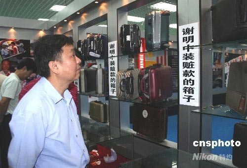 六月三日,海口開幕的2008海南反腐倡廉警示教育展覽,展出原海南省委委員、文昌市委書記謝明中裝贓款的十八只箱子,以及價(jià)值四十萬元人民幣的滿天星手表等贓物。謝明中在擔(dān)任文昌市委書記期間,利用職權(quán),在工程審批、資金安排、干部提拔等方面為他人謀取利益,大量收受或索取賄賂,還與多名女性發(fā)生不正當(dāng)男女關(guān)系。海南省紀(jì)委共查獲謝明中轉(zhuǎn)移或藏匿的賬款折合人民幣兩千五百余萬元,另有金銀首飾等物品十七件。中新社發(fā) 關(guān)向東 攝