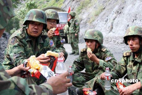 運(yùn)糧途中的午餐,官兵們嚼著方便面就礦泉水。車(chē)上滿(mǎn)滿(mǎn)的食物,官兵們是一點(diǎn)都不能動(dòng)的。中新社發(fā) 曾憲平 攝