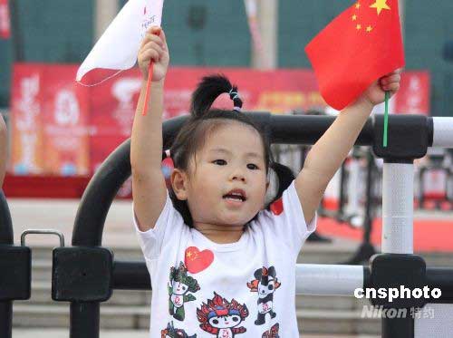 廣西南寧一位小朋友在民族廣場(chǎng)為即將到來(lái)的奧運(yùn)火炬歡呼。中新社發(fā) 劉萬(wàn)強(qiáng) 攝